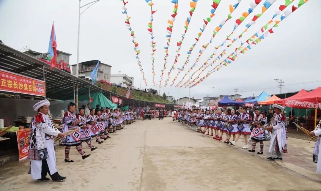 在马楠乡马楠村委会,一大早苗族同胞便身着节日盛装,跳起欢快的芦笙舞,端着醇美的羊角酒,整齐排列在寨门两旁,以苗家礼仪“三道酒”喜迎八方宾客。