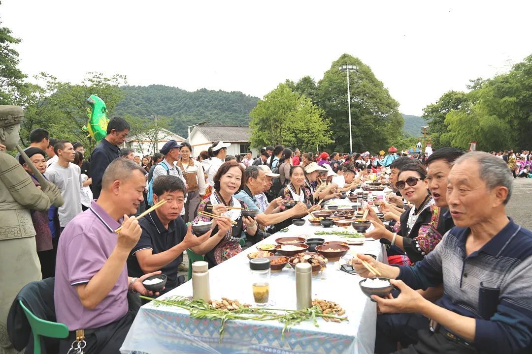 苗家长桌宴是苗族隆重的宴席形式。中午12时,来自各地的游客围坐在长桌周围,共同体验苗家长桌宴。