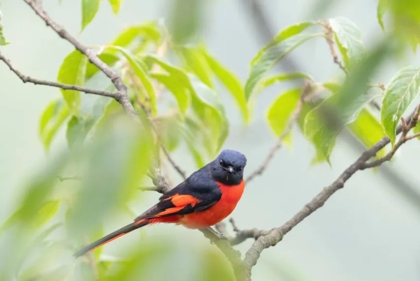 长尾山椒鸟,雀形目鹃鵙科山椒鸟属的鸟类,具红色或黄色斑纹,尾形长。雄鸟红色,头部黑。雌鸟额基黄色。两道翼斑汇聚于粗带。
