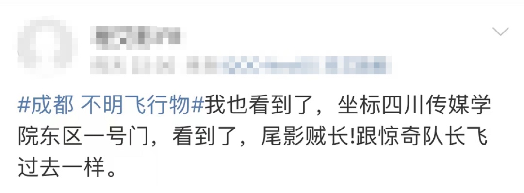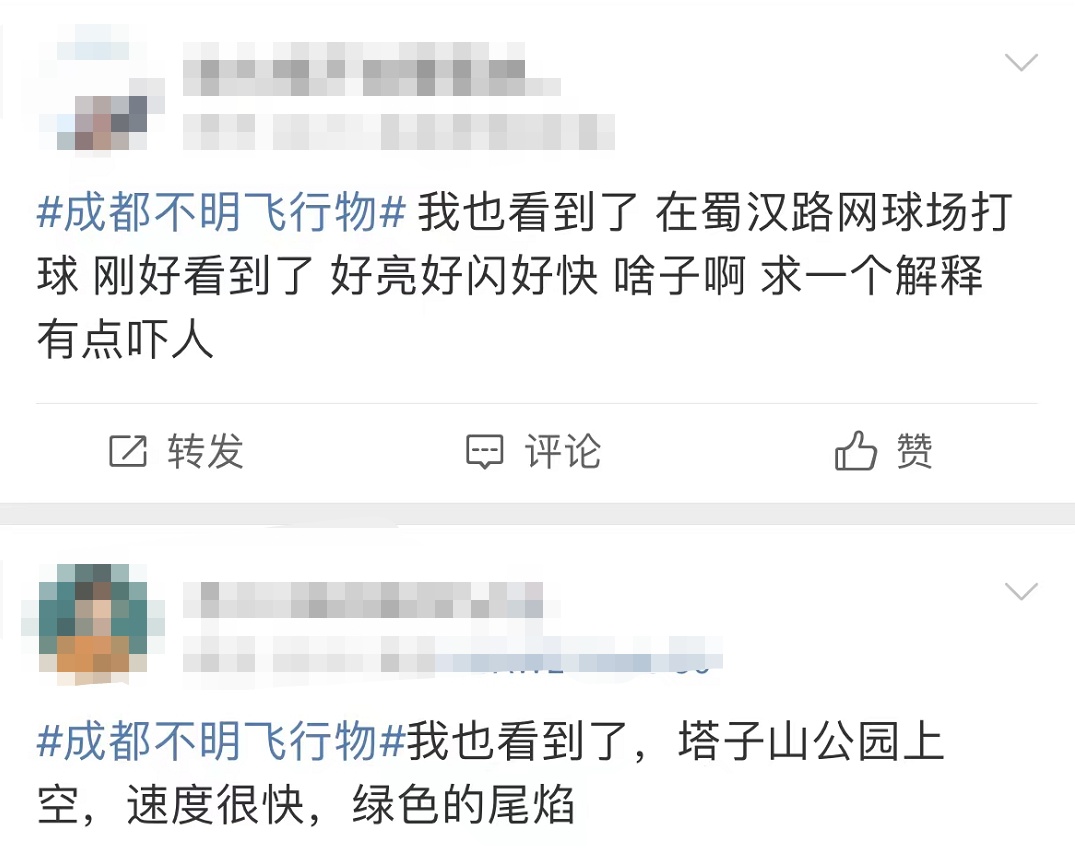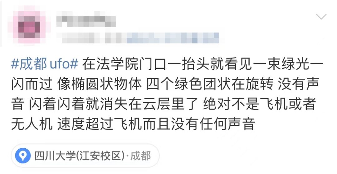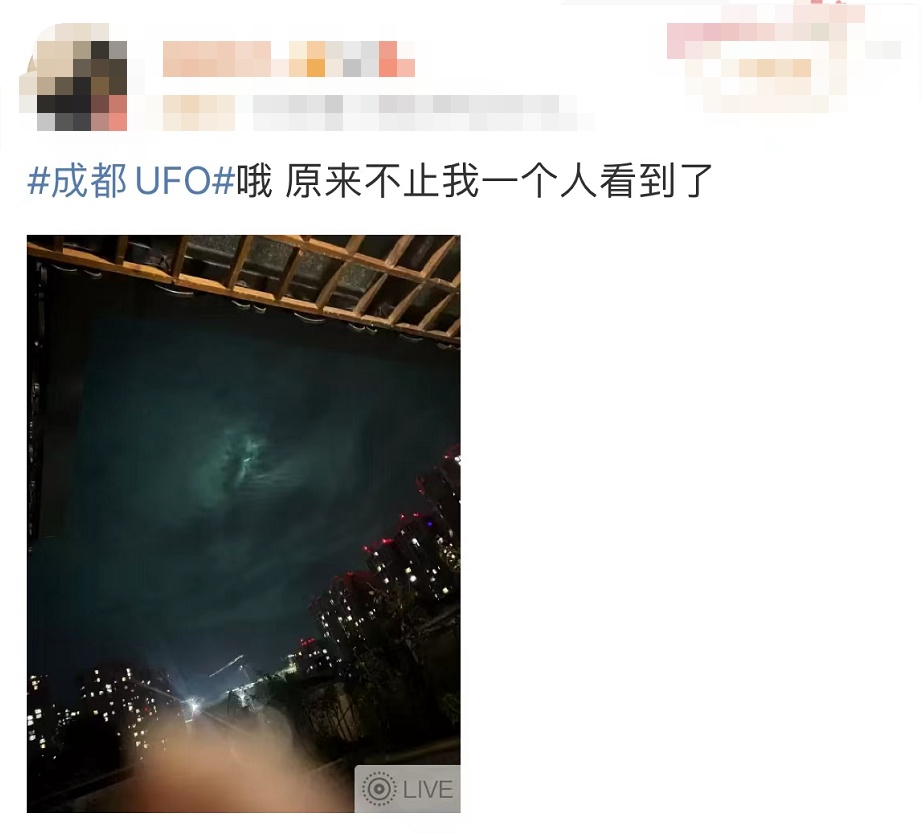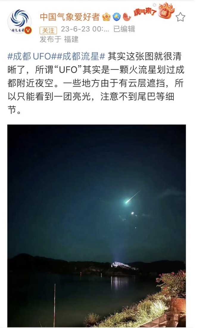 6月23日凌晨,知名科普博主@中国气象爱好者 发文称,所谓“UFO”其实是一颗火流星划过成都附近夜空。一些地方由于有云层遮挡,所以只能看到一团亮光,注意不到尾巴等细节。