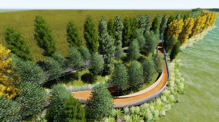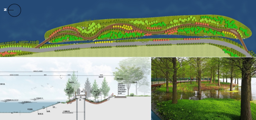 化劣势为优势,妙手解难题。东引河规划宽度90米,充足的河口宽度提供了广阔的发挥空间,为廊道滨水空间提供了以下林水复合创新契机。