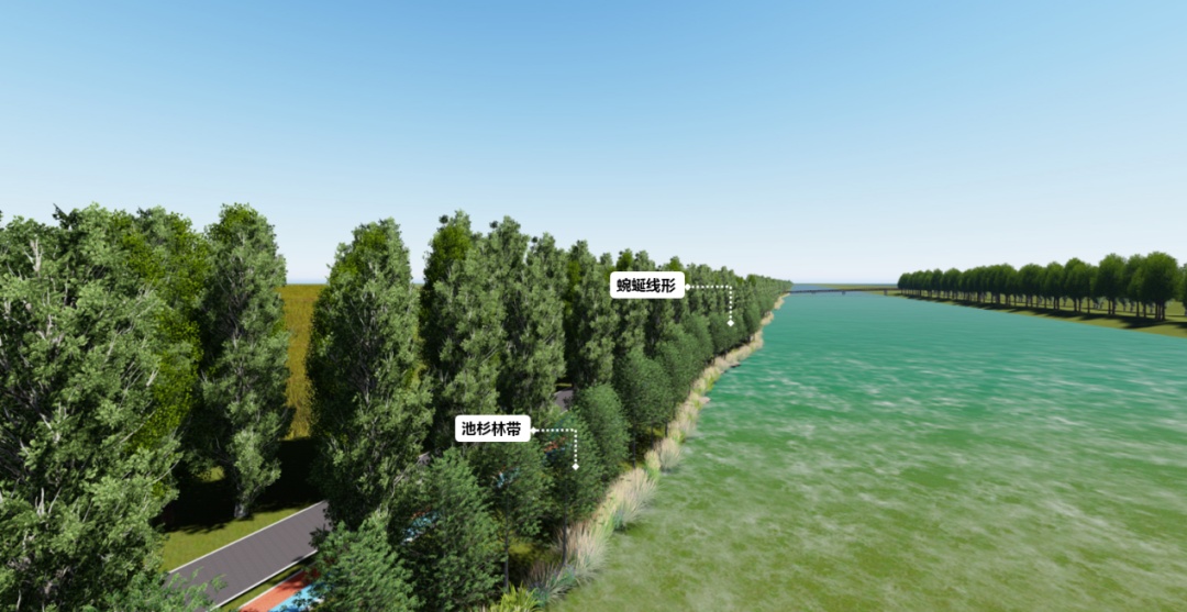 乔木种植遵循背景林带密植,前景林带留空的种植模式,采用四排品字形种植形式,确保林带的郁闭度符合成林的标准。同时分为三大层级种植,分别为临水侧池杉种植带,中部组团点景绿化带,陆域控制边线背景杉树林带,在达到成林的标准,又形成构成一道绚丽的植物色带,打造景观观赏特色。