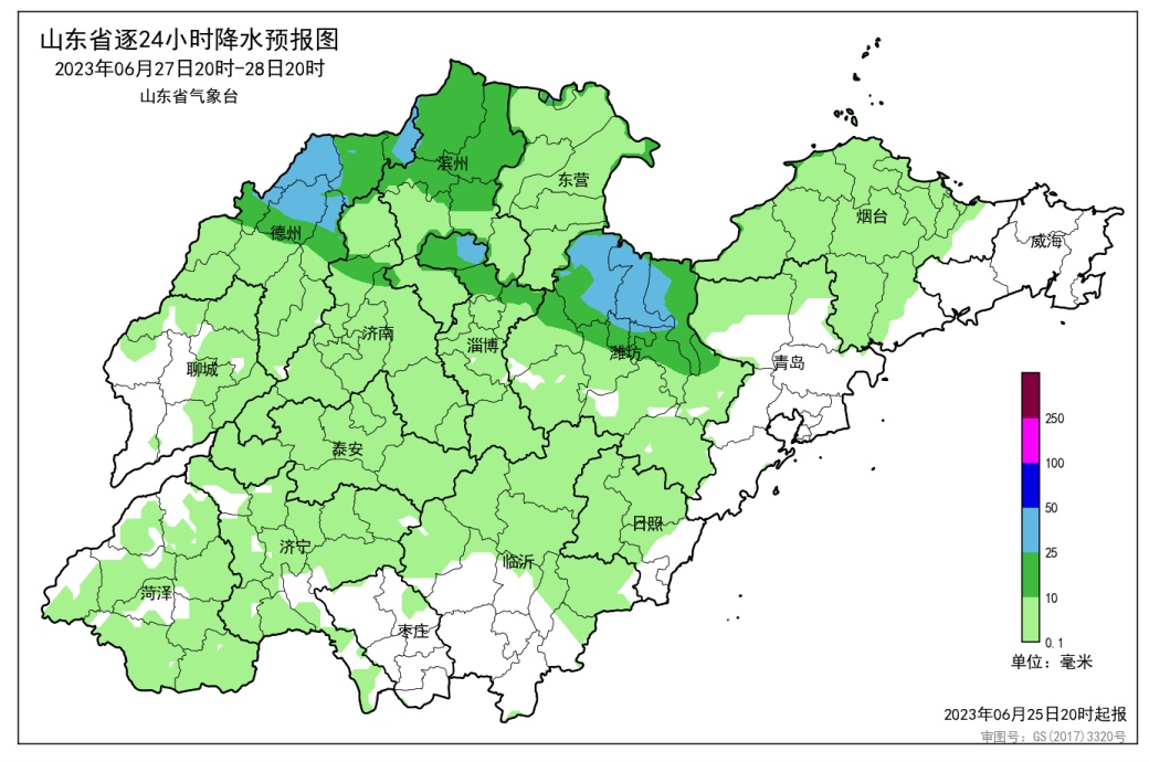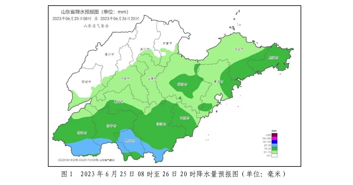 据山东气象台发布的消息指出,受低涡切变线影响,预计25日白天至26日鲁南、鲁中和半岛地区有一次降雨过程,鲁南地区主要降雨时段在25日白天到夜间,鲁中和半岛地区主要在26日白天。全省累计平均降水量8—15毫米,其中,菏泽、济宁、枣庄、临沂和日照有中雨局部大雨(10—20毫米局部25毫米以上),泰安、潍坊、烟台、威海和青岛有小到中雨(5—15毫米),济南南部和淄博有小雨(3—8毫米),其他地区多云。此次降水过程可缓解高温天气,有助于农田增墒及夏播作物苗期生长。