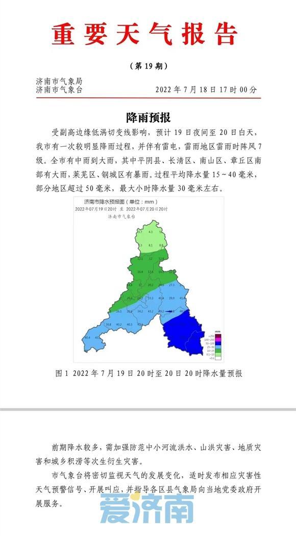 2022年7月19日-20日,同样受副高边缘的低涡切变影响,济南出现一次较明显降水过程。根据当时天气预报,济南雷阵雨伴有阵风7级,最大小时降水30毫米左右。