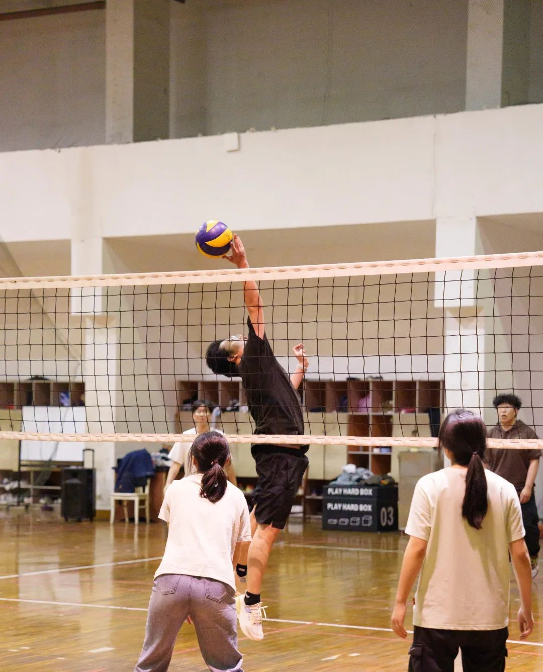 排球飞越网口,阵阵欢呼伴随
