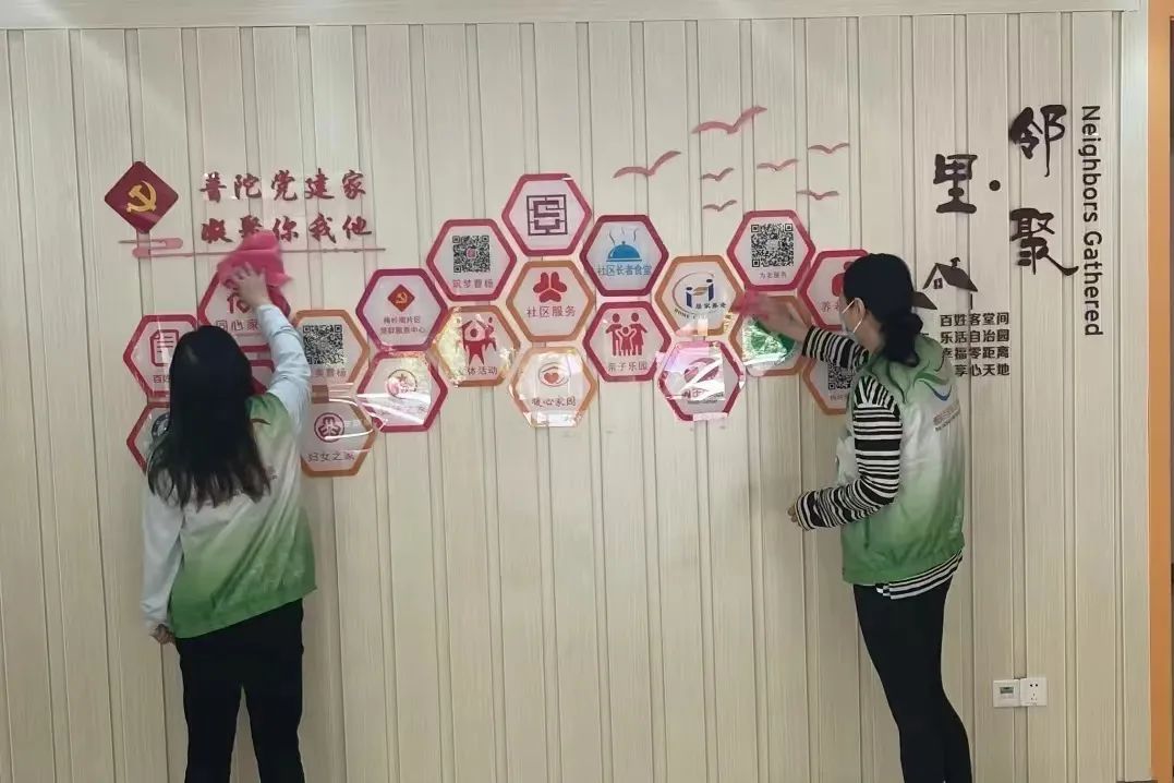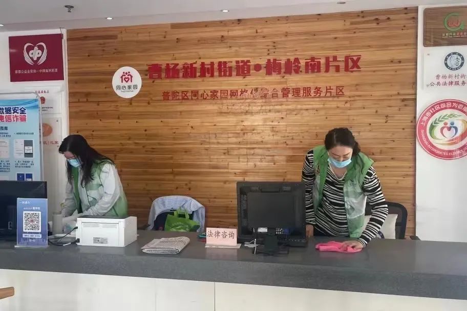 身着“绿马甲”的志愿者们也围绕着曹杨社区服务中心,维护着墙面、台面、地板等环境点位的整洁卫生,用“滴滴汗水”传递着文明的“花种”。