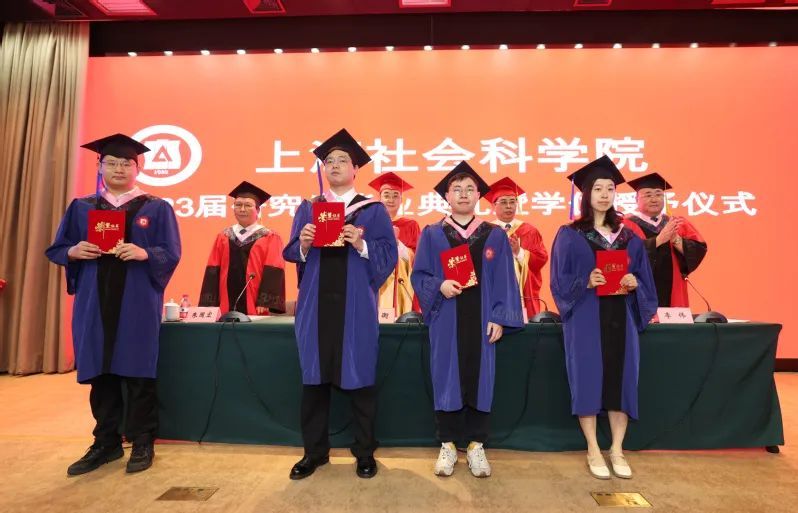 在毕业典礼上,权衡宣读荣获2023年度“上海市优秀毕业研究生”和“上海社会科学院优秀毕业研究生”名单,并为获奖毕业生颁发荣誉证书。朱国宏宣读“上海社会科学院授予学位决定”,王德忠接受了毕业生代表的集体献礼,并为全体毕业生一一拨穗、颁发学位证书并合影留念。