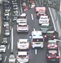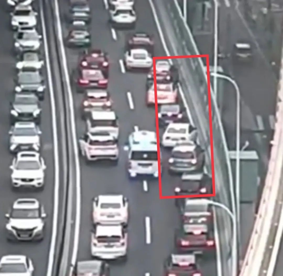 拥堵的车辆自然而然地呈45度让位前行,把车头紧紧贴住高架护栏,快速让出一条道来。