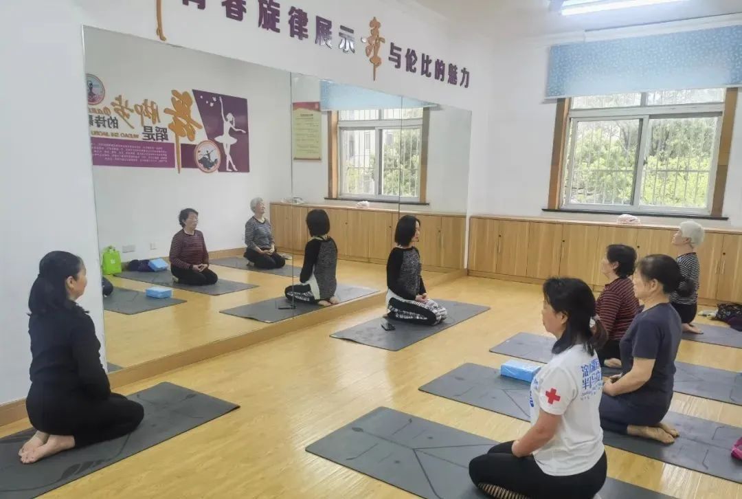 瑜伽班的学员们在老师的带领下,不断调整姿势,通过呼吸、调息、冥想等练习,在动静中舒展全身,沉浸在瑜伽锻炼的宁静和愉悦中,起到锻炼身体、舒缓压力的作用。