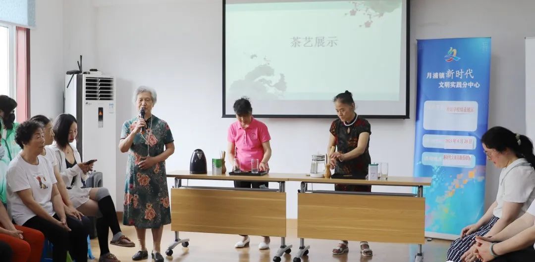 茶艺班的学员们现场演示了泡茶流程和沏茶艺术,泡茶手势自然优雅,动作轻柔,整体流程一气呵成。大家捧杯一起慢杯细酌,互相切磋茶艺,在座的居民们也感受到中华茶文化的博大精深。