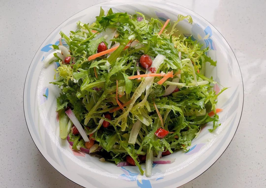 第四步:将苦菊、洋葱丝、胡萝卜丝放入拌菜锅中,倒入调好的料汁、花生搅拌均匀后食用。
