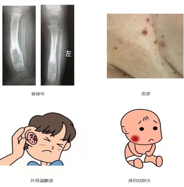 小婴儿经常会表现为发热、皮疹、肝脾肿大;两三岁的孩子会有颅骨缺损、多饮、多尿、突眼、耳朵流脓等;而学龄期孩子经常只有骨质损害。
