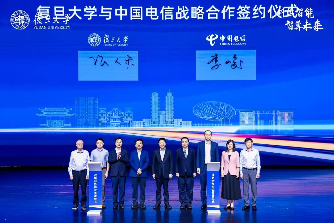 为进一步发挥高校、企业各自优势,加速创新链条,实现小切口、强突破、硬联通的发展目标,复旦大学与阿里巴巴、中国电信分别签署战略合作协议,建立长期、紧密、稳定的校企合作新格局。中国科学院院士、复旦大学副校长张人禾,阿里云智能首席技术官周靖人代表双方签署复旦大学——阿里巴巴全面战略合作协议,裘新、金力、王坚、吴金城、陈石燕、王浩、赵健见证。张人禾、中国电信集团有限公司副总经理李峻代表双方签署复旦大学——中国电信集团有限公司战略合作框架协议,裘新、金力、邵广禄、吴金城、陈石燕、王浩、赵健见证。