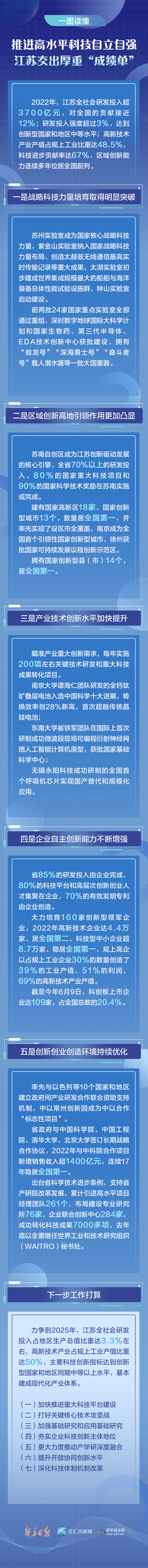 6月27日,江苏省召开“努力推动江苏在高质量发展中继续走在前列”系列主题新闻发布活动首场——推进高水平科技自立自强专场新闻发布会。江苏的科技发展取得了哪些成就?未来有哪些工作打算?一图读懂↓