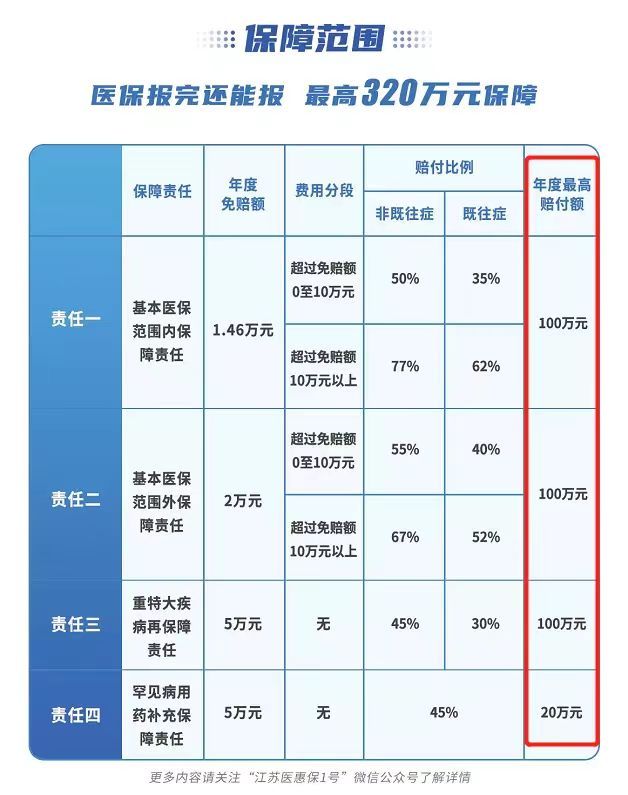 2023年度“江苏医惠保1号”参保人数达到507万人。保费为每人158元,年度免赔额1.46万元,超过免赔额以上至10万元以内(含10万元)部分,按照50%的比例赔付;10万元以上部分,按照77%的比例赔付,年度累计最高赔付限额100万元。