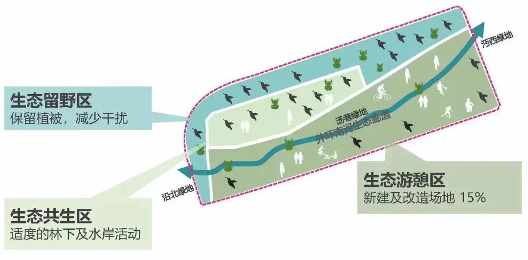 汤巷公园改造在满足居民使用需求的同时,坚守生态底线。根据改造力度、人类干扰度的差异,将地块由南至北分为生态游憩、生态共生和生态留野三大生态片区。