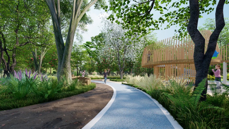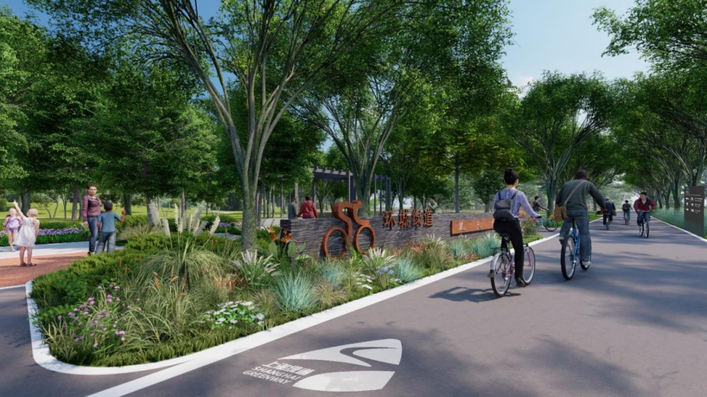 以“骑行+跑步+慢步道”组合的形式,构建绿道骨架,总长1.5km。未来还将与沿北公园、沔西公园的绿道无障碍连通,完善浦东环上“慢行系统”。同时增加标识标牌、驿站、LOGO景墙等,结合植物景观提升,打造特色骑行游线。