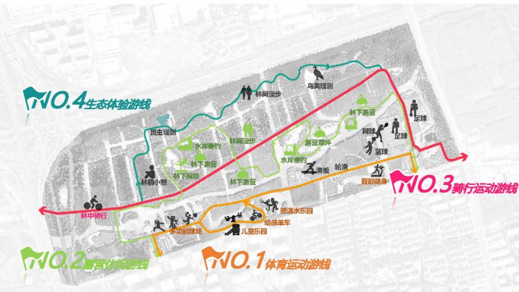 重组体育运动游线、露营休闲游线、骑行运动游线、生态体验游线四条游览线路,串联起生态空间和活动场地,增强公园的整体游览性。