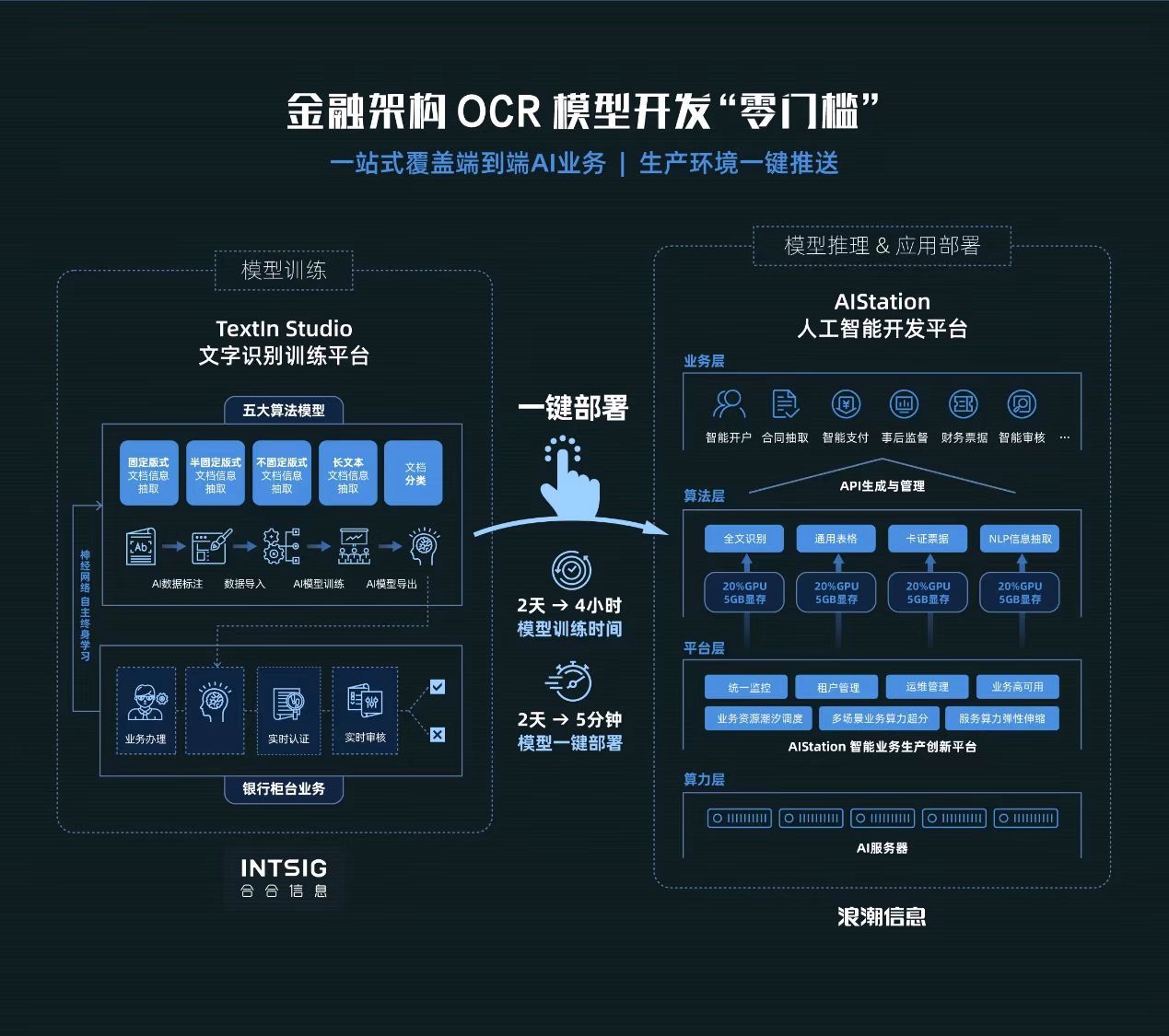在与浪潮信息的元脑生态战略合作基础之上,合合信息共享浪潮信息在AI计算、资源与算法方面的全栈能力,并基于智能文字识别技术,携手打造了一站式智能OCR解决方案。该方案具备零门槛构建OCR模型和一键部署模型两大核心功能,集成了合合信息智能文字识别训练平台,浪潮信息AI服务器NF5280M6、浪潮信息AIStation智能业务生产创新平台,内置超过100种常用OCR模型,可迅速应用于银行大部分业务场景,能够基于少量样本快速开发、迭代和部署OCR模型,满足银行智能OCR应用需求,实现票证录入智能化。