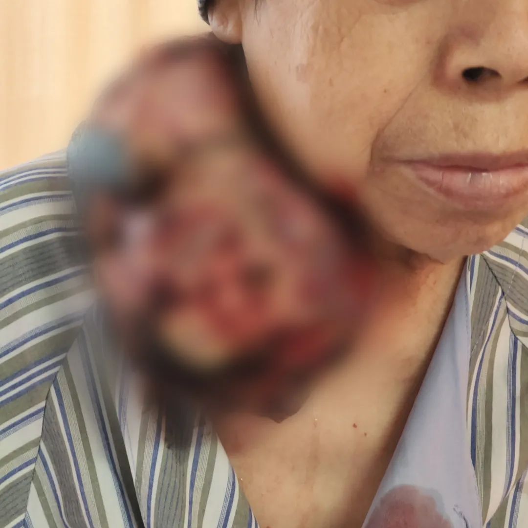 半个月前,在得到赵阿婆全家的理解后,在麻醉科和手术室团队的帮助下,吴医生团队在全麻下施行颈部巨大肿瘤切除加右颈淋巴结清扫术,在肿瘤广泛浸润侧颈部的情况下,通过精细解剖,完整切除肿瘤,保护颈动静脉及颈部纵横交错的神经,同时行皮瓣整形,I期缝合切口覆盖创面。
