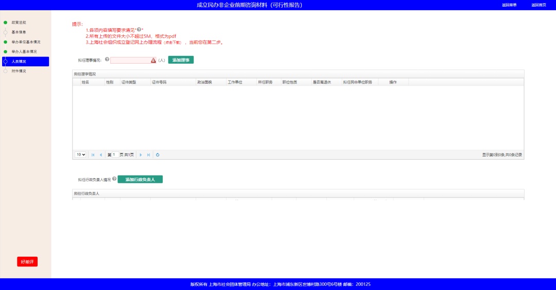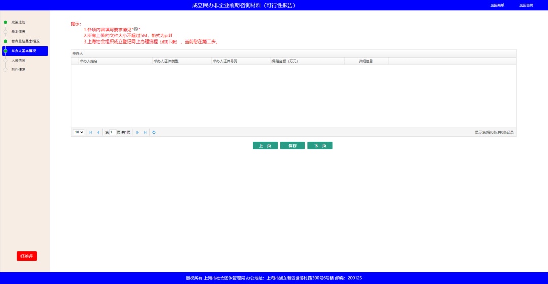 阅读相关的政策法规,并根据页面引导逐步填报机构基本信息、举办单位情况、举办人情况、人员情况以及附件情况。