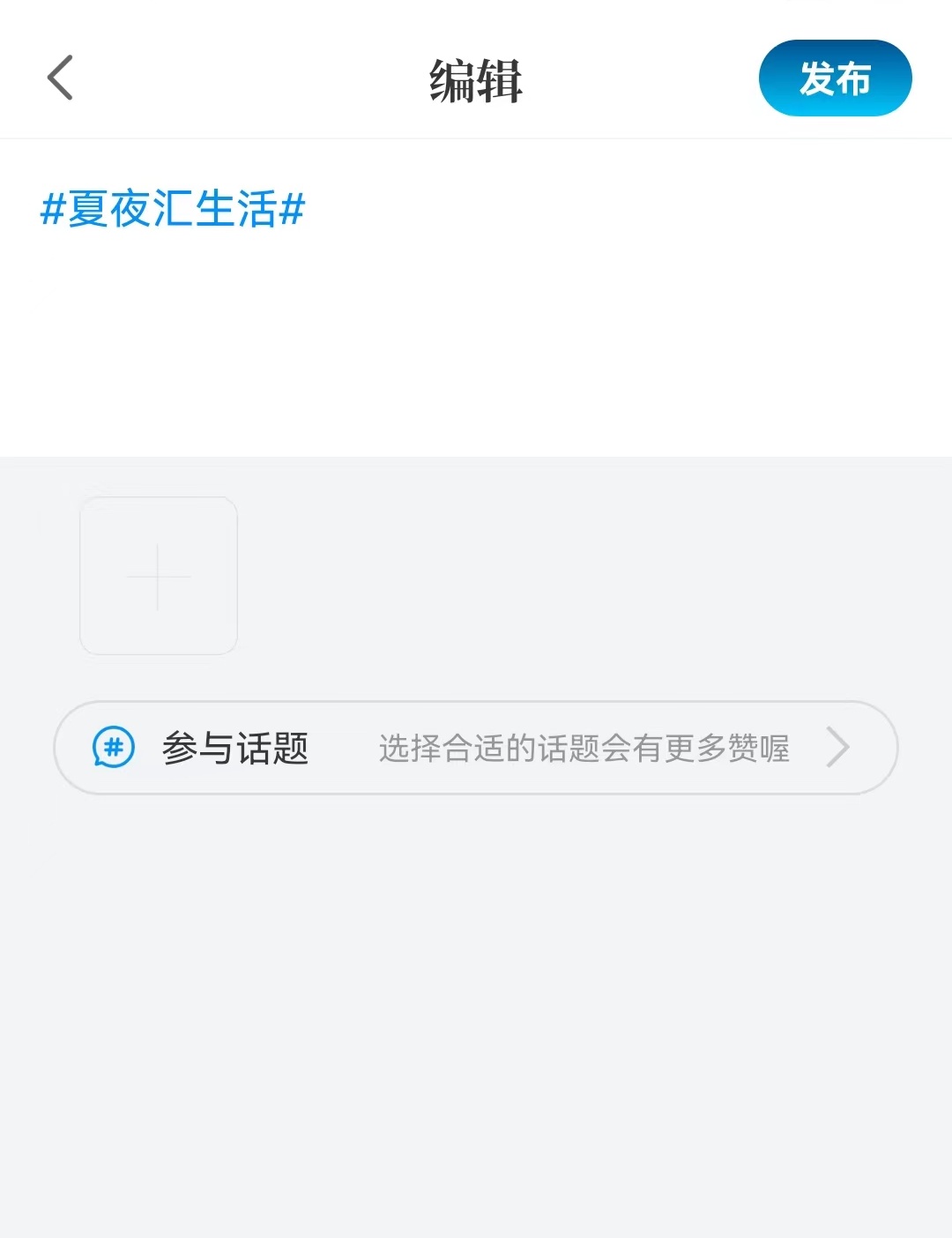 选择“夏夜汇生活”话题页面,点击“+”号,按照格式:#夏夜汇生活#+摄影作品+简要描述,上传随手拍摄的相关作品并进行发布提交。