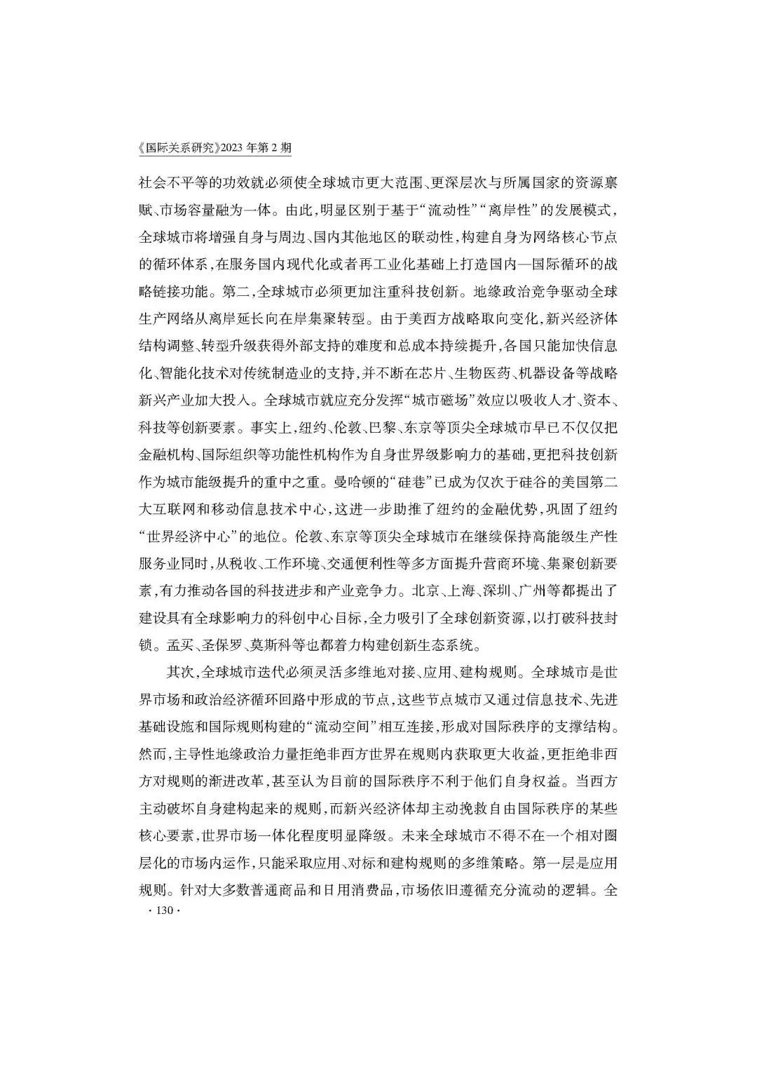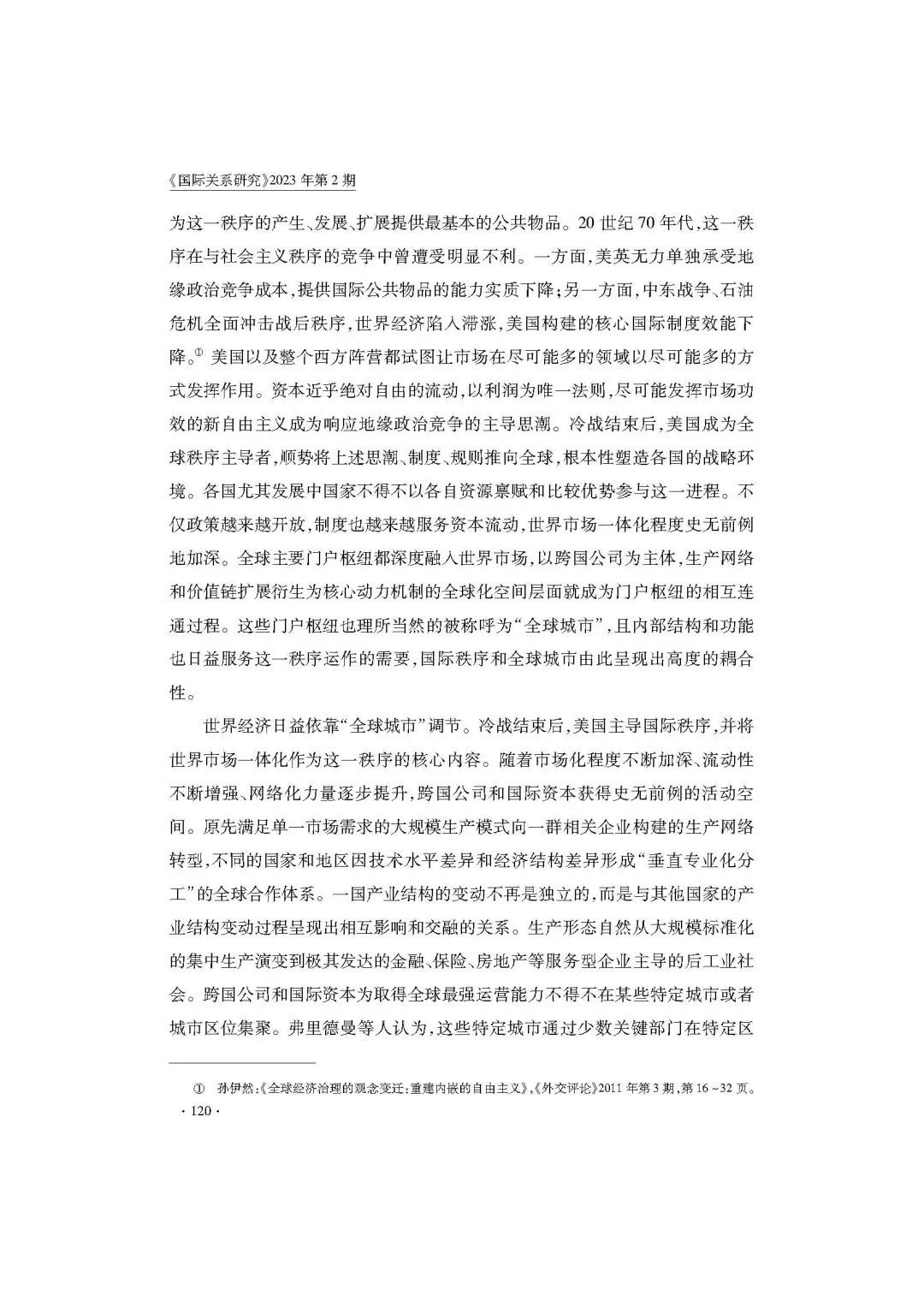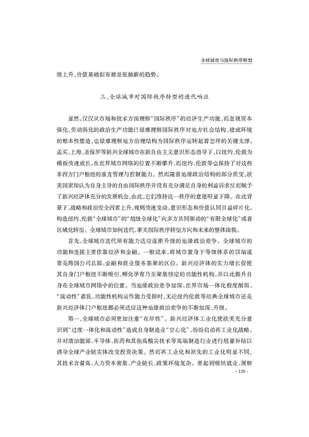 [内容提要] 美国为支撑霸权构建了以流动性为核心的自由国际秩序,全球城市作为集聚特定功能性机构的特定区域为该秩序提供了关键支撑。全球城市的作用主要体现在:世界市场一体化主要依靠“全球城市”调节;国际规则主要通过“全球城市”具象化;国际秩序主流意识形态通过“全球城市”合法化。随着新兴经济体的崛起,国际秩序在结构、规则和价值层面转型,对“全球城市”生成路径带来冲击。地缘政治结构变化带来安全因素上升,重塑全球城市发展动力;国际规则受到实质挑战,重塑全球城市成长轨迹;国际秩序主流意识形态整合能力下降,重塑全球城市价值基础。全球城市对上述转型迭代响应,这要求适应逐渐升级的地缘政治竞争,更加注重“在岸性”和科技创新;灵活多维的对接、应用、建构规则,挖掘各种可能的机会;扬弃新自由主义意识形态,更注重以人为本的价值观。通过转型,“全球城市”可为国际秩序的稳定性做出相应建设性贡献。