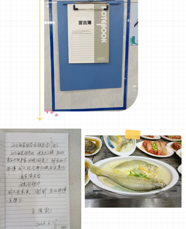在大厅增设留言区域,并附上餐厅工作人员微信,邀请居民留言。有个性化需求的居民,可以提前留言。在条件允许的情况下,食堂将满足菜品预留、定制服务等需求。