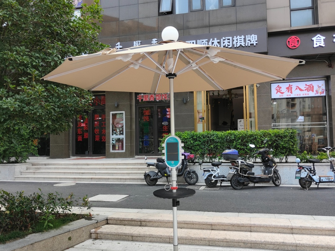 小编了解到,在“美丽街区”整治工程项目中,新增了一种“晒晒太阳”就能发电的太阳能户外伞。这种伞不但具有户外伞的遮阳、挡雨等功能,并且通过太阳能发电与储电,是集照明、充电、驱蚊、风扇降温、景观共享、广告投放等功能为一体的多功能户外伞。在清河湾街区总计安装了8把共享智能伞,分别位于清河湾佳苑居委对面、卓越商业街(竹盈路北侧)靠河边位置、桃源埔居委附近。太阳能户外伞的安装给附近的居民带来了方便。
