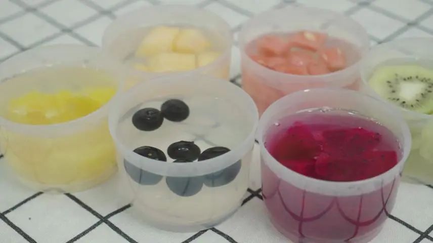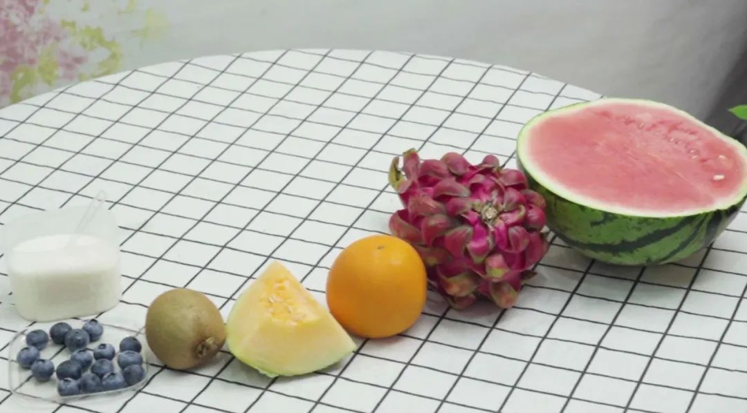 食材:白糖、白凉粉、蓝莓、猕猴桃、哈密瓜、橙子、火龙果、西瓜