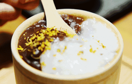 食用时,先舀一大勺糯米,舀一大勺绿豆,几块冰,一勺白砂糖,几滴薄荷油