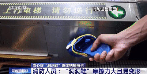 江苏扬州市消防救援支队 姚相宇:洞洞鞋采用的材质比较柔软,鞋头设计也比较宽大。人们穿着这种洞洞鞋上下扶梯时,即使站在黄线区内,只要稍稍靠边,就有可能和边上的护栏发生摩擦被卷进去。