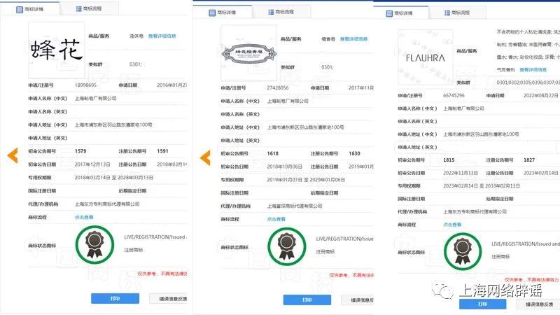 根据国家知识产权局商标局官网,上海制皂和蜂花日用品两家公司都持有“蜂花”商标,适用于不同商品
