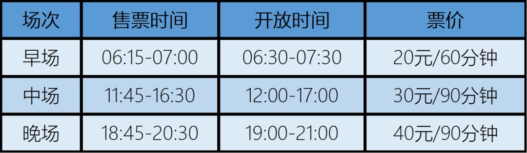 中、晚场每场时间均为90分钟(含沐浴、更衣),每场超时45分钟以内补半票,45分钟以外补全票;