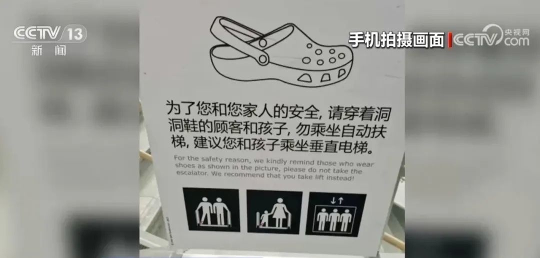 近日,不少商场发出安全提醒:尽量不要穿洞洞鞋乘坐自动扶梯。
