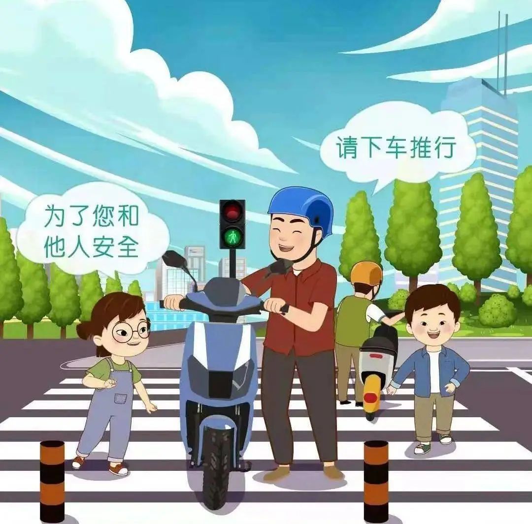 4.通过路口或横过机动车道时,应注意观察来往车辆,过人行横道应下车推行。