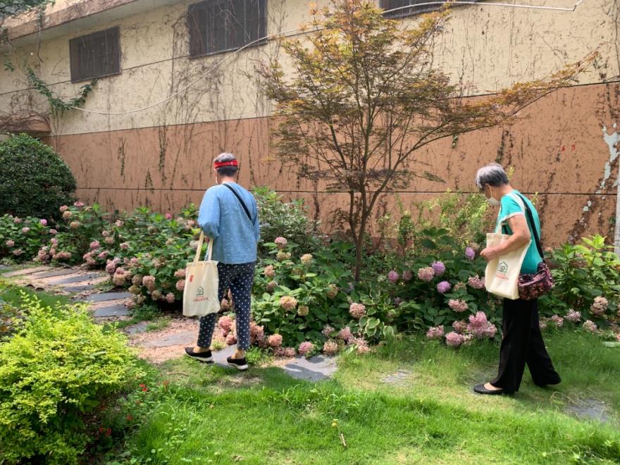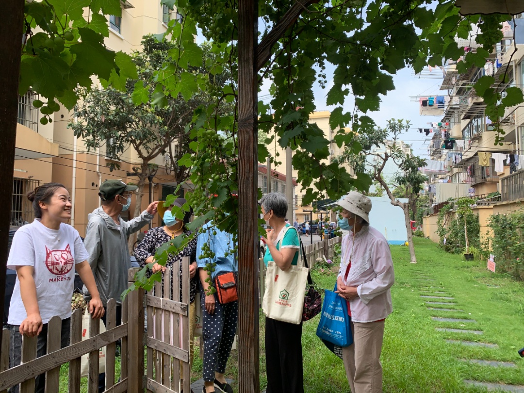 社区老年居民是“生态园与你为伴”系列活动的第三批受邀参观者,他们中的不少人是第一次踏入这片花园,对于花园的美丽和生机感到十分惊叹:“真是蛮灵的!”在生态园中,老人们发现了一座葡萄架,当即有人说自己家里也有一株葡萄藤,可以将它移植到这里来。他们一边参观一边交流植物养护经验,热爱植物的居民表示很乐意搬出家里的盆栽,为生态园多增添一抹色彩。