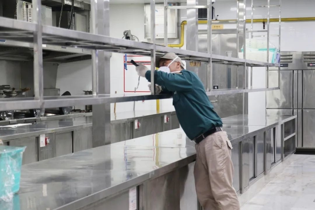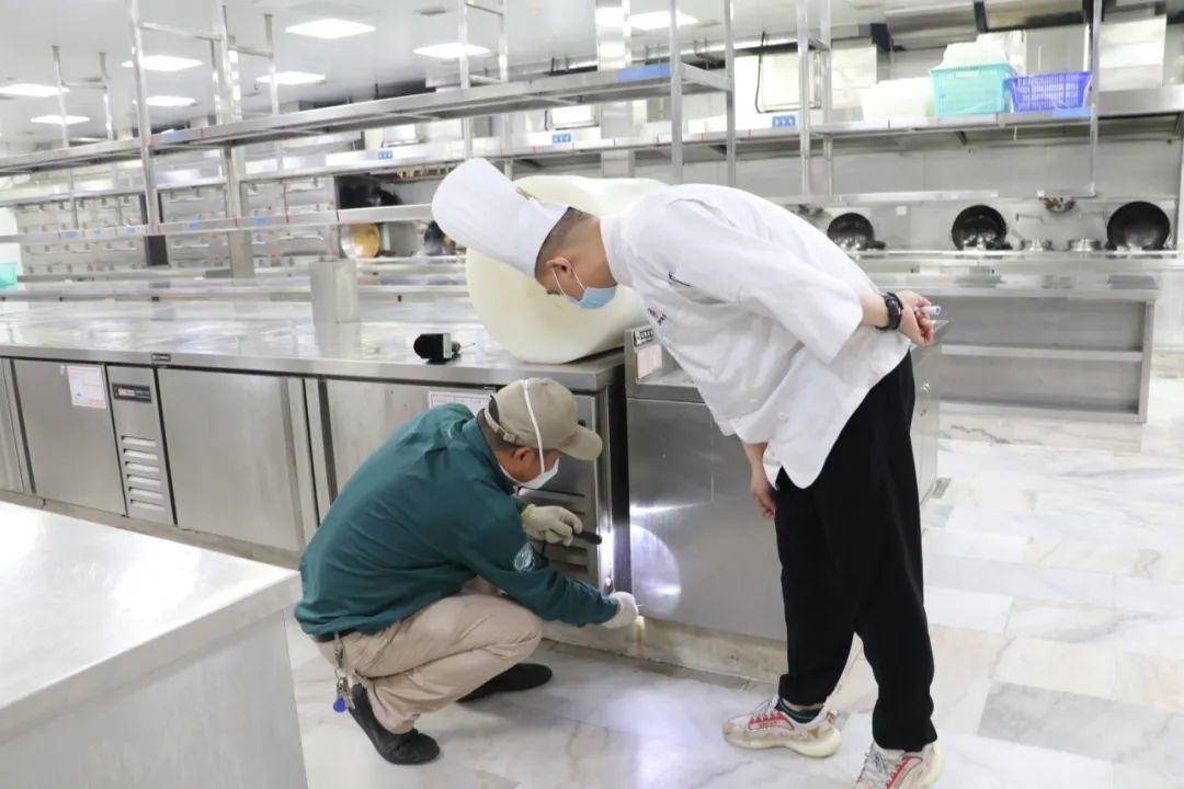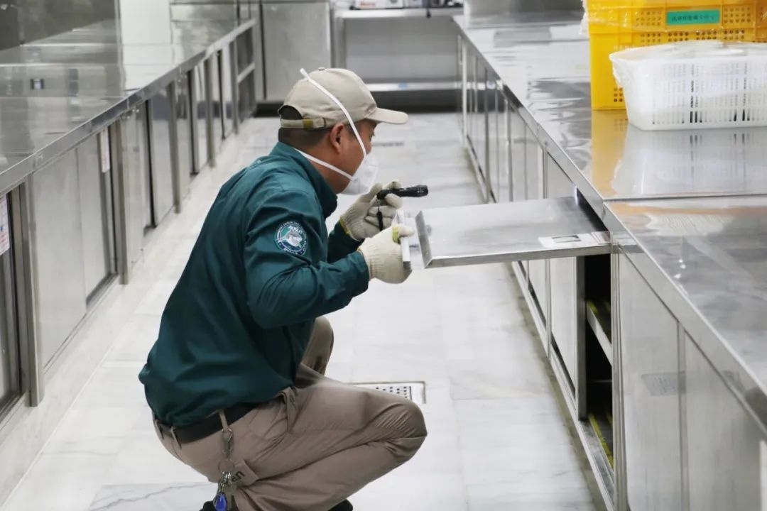 上午,病媒生物防治工作人员来到朱泾镇的一家大型酒店后厨,对场所内的柜子底部、消毒橱柜死角等相对隐蔽,但却最容易孳生蟑螂、蚊虫的卫生死角进行查看及清理。虽然酒店已经在部分死角处放置了粘蝇板,但都已沾满了蚊虫,工作人员对粘板进行了更换,并在发现活蟑螂的区域,涂上了杀蟑饵剂。