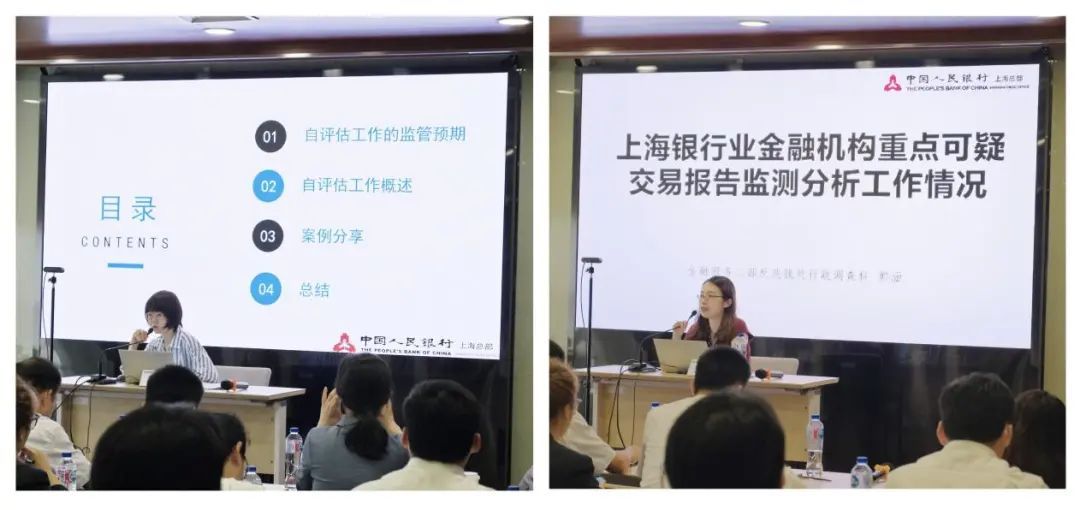 本次培训特邀中国人民银行上海总部金融服务二部反洗钱处董丽瑶和郭涵担任主讲嘉宾,培训主题分别为“商业银行洗钱风险自评估及典型案例介绍”和“上海银行业金融机构重点可疑交易报告监测分析工作情况”。