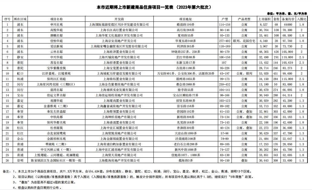记者近日从上海市房管局获悉,2023年上海第六次以集中批量供应的方式推出房源,共涉及26个项目。