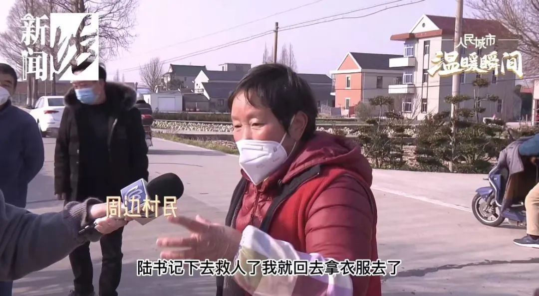 周边村民看到陆东辉在水中救人,立马跑回家拿衣服,“陆书记下去救人了,我就回去拿了棉毛裤、内裤、毛巾、大衣、裤子,我拿在手里,想着等他们上来,就直接给他们穿了。”