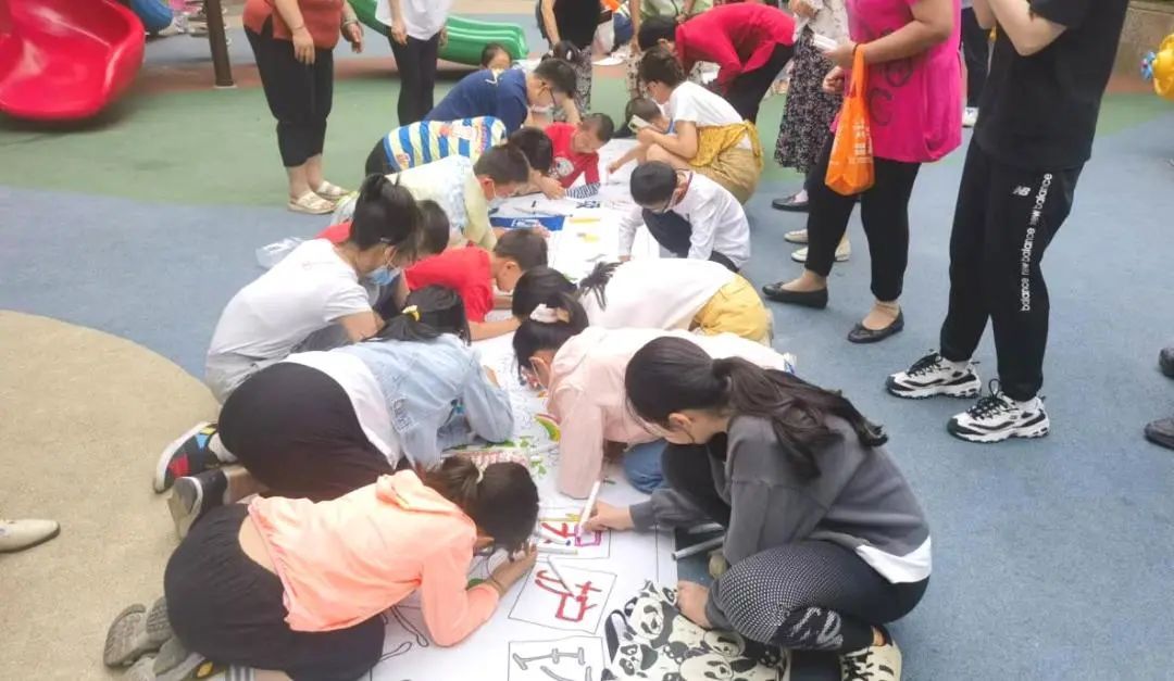 “小先生”们化身社区美容师和环保实践家,举起手中丰富多彩的画笔对百米画卷进行大胆地涂鸦创造,家长们也在边上传递画笔、出谋划策,协助孩子共同完成“创意”。虽然天气十分闷热,但活动现场的家长和孩子们都热情高涨。在家长和孩子的齐心协力和孩子们的互相合作下,黑白线稿的画卷逐渐变得色彩斑斓,儿童乐园充满了孩子们的欢笑声,大家一起举起完成的作品,共同约定“要做好垃圾分类,坚持低碳环保,守护环境卫生”。
