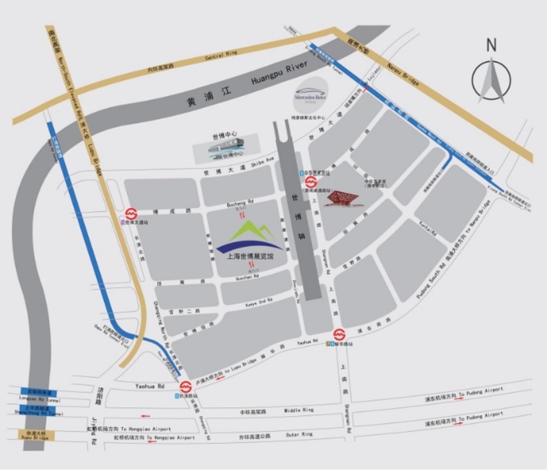 乘坐轨道交通13号线至世博大道站1号口,步行760米,持参会凭证可由世博中心2号门或世博展览馆北门(博成路850号)进入。