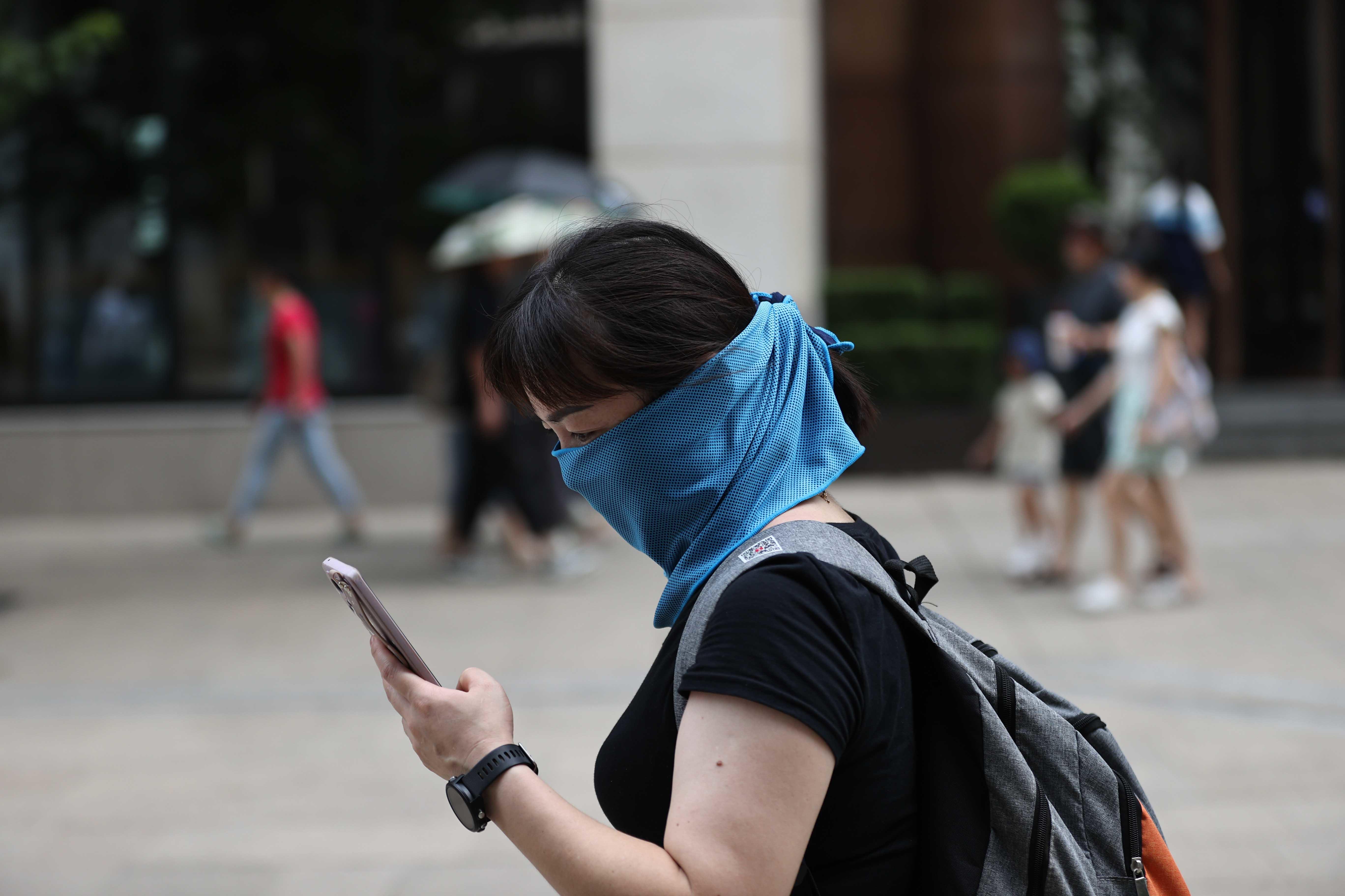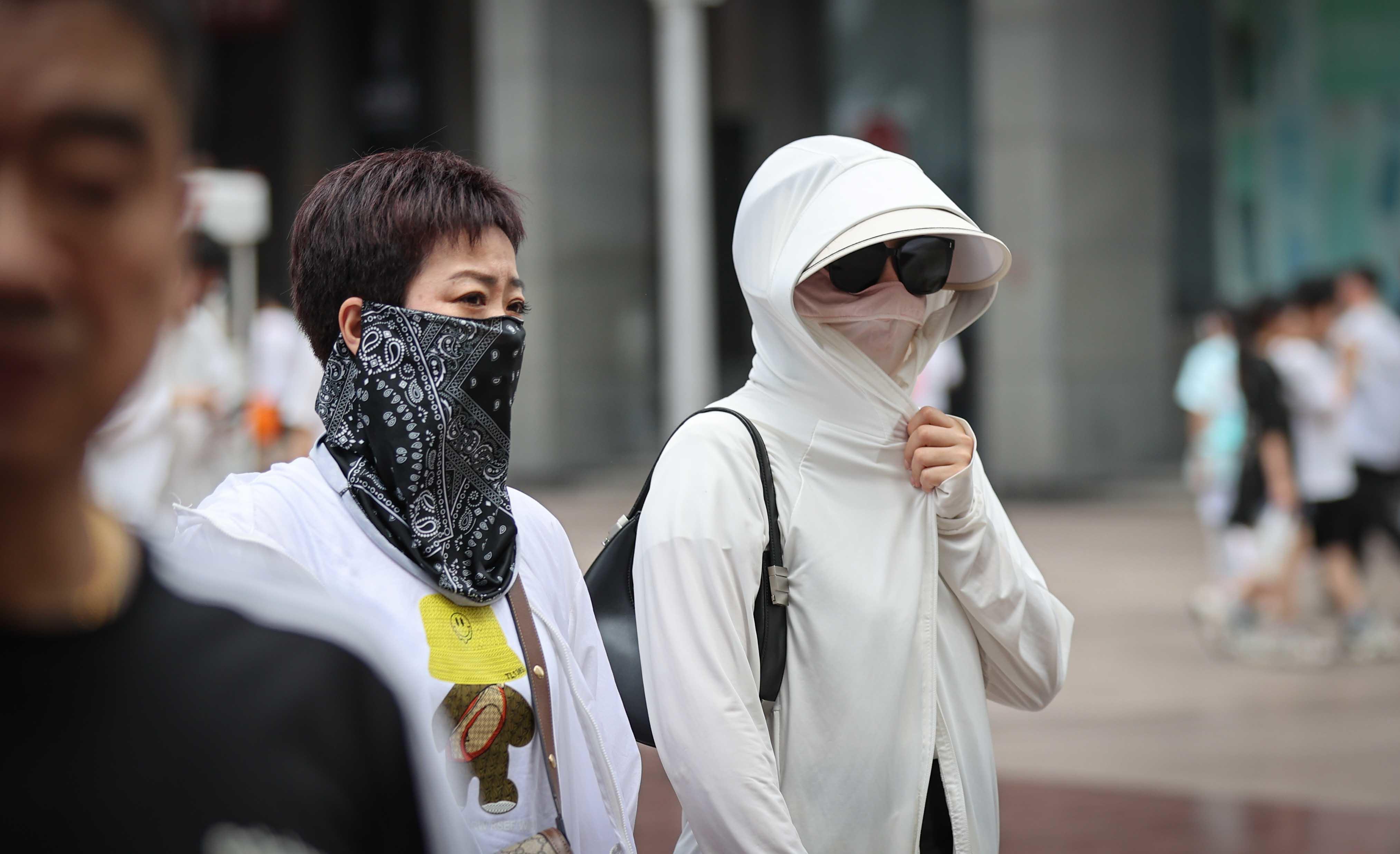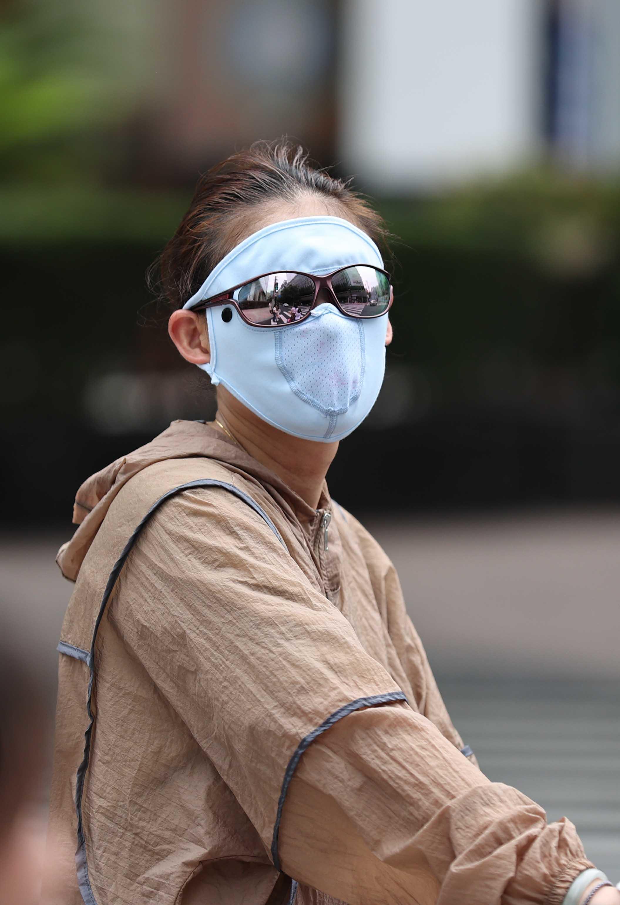 除往年常见装备外,最近爆款的“脸基尼”防晒面罩成为了烈日下的一道独特风景。