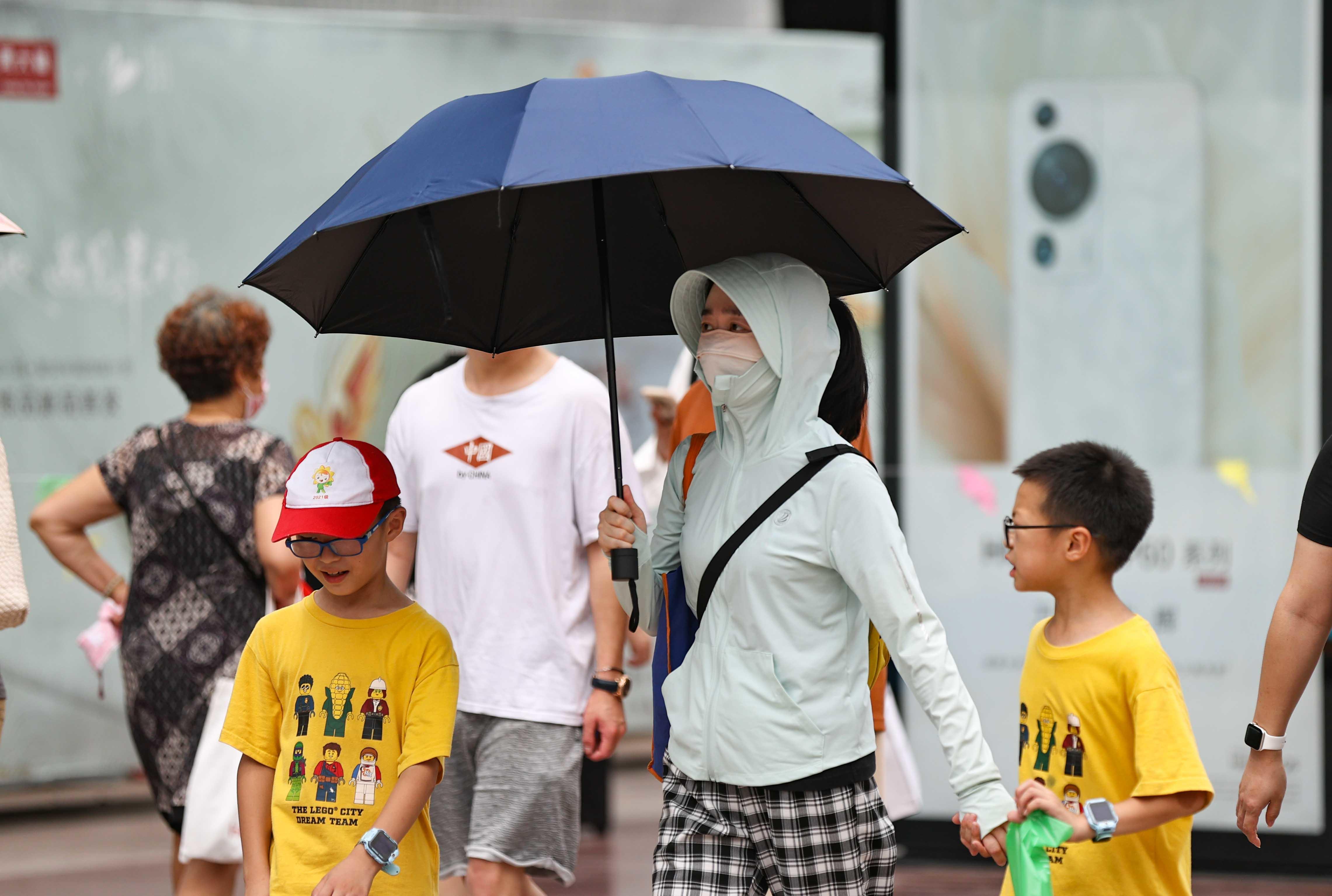 连日来,申城发布高温黄色预警,烈日炎炎,为做好出行防晒,市民游客是各显神通,各式各样的防晒神器闪亮登场。记者在南京东路步行街看到,有人头戴太阳帽,撑着太阳伞;有人身着防晒衣,把自己包裹得严严实实;还有的人墨镜、面罩、帽子、手套齐上阵……