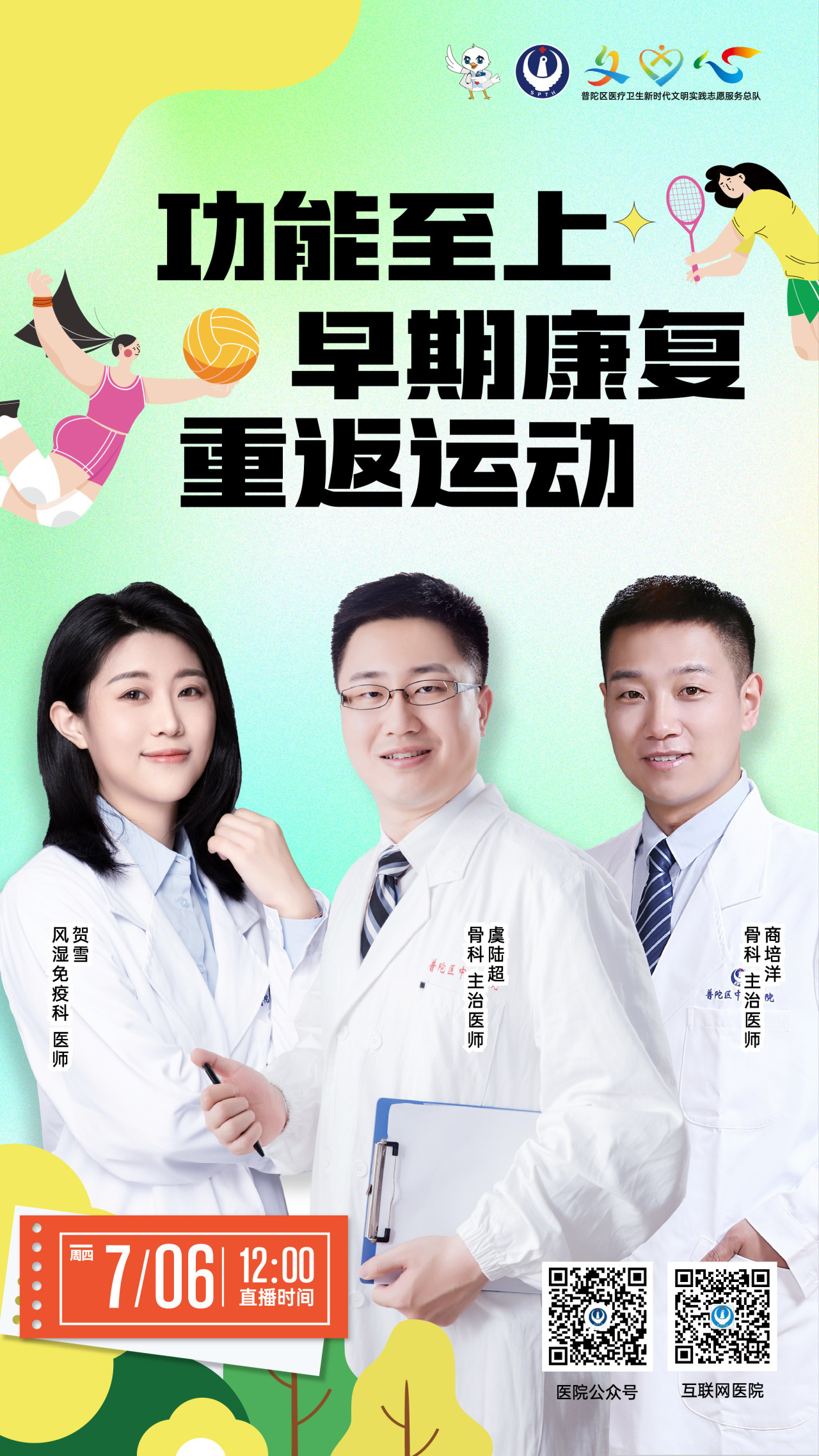 7月6日(周四)12:00,普陀区中心医院5G健康直播间将以《功能至上 早期康复 重返运动》为主题,由骨科主治医师虞陆超、主治医师商培洋、风湿免疫科医师贺雪一起搭档,带你了解骨折术后如何快速康复。观众朋友们,让我们不见不散~