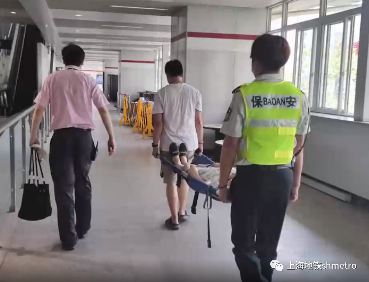“她还有一点意识,问她要不要叫救护车,她说休息会儿就行。”考虑到嘉定新城站是露天高架车站,当时气温已经达到35°C,丁文杰判断女乘客是中暑,便第一时间找来担架,同其他工作人员合力将女乘客抬到了有空调的站房区域。