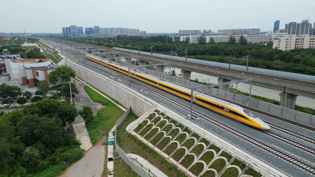 试验列车驶过沪宁沿江高铁常州特大桥滆湖段