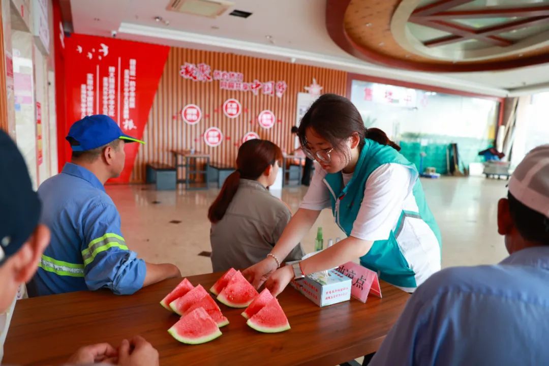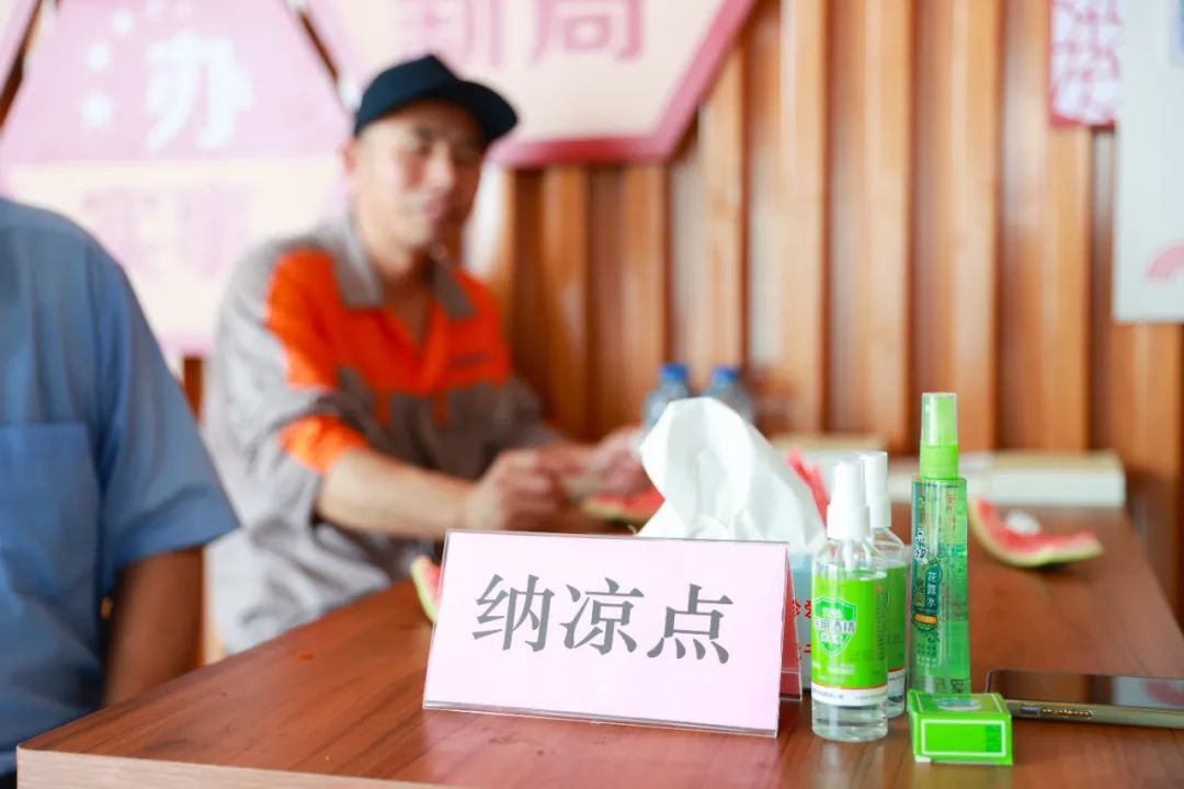 记者在文翔商厦底楼的爱心驿站看到,不时有户外工作者进来歇歇脚、喝口水。茶水补给、风油精、花露水……除了常规的防暑降温物品,这里还不定时提供绿豆汤、盐汽水、西瓜等消暑食物,为户外工作者送去夏日清凉。
