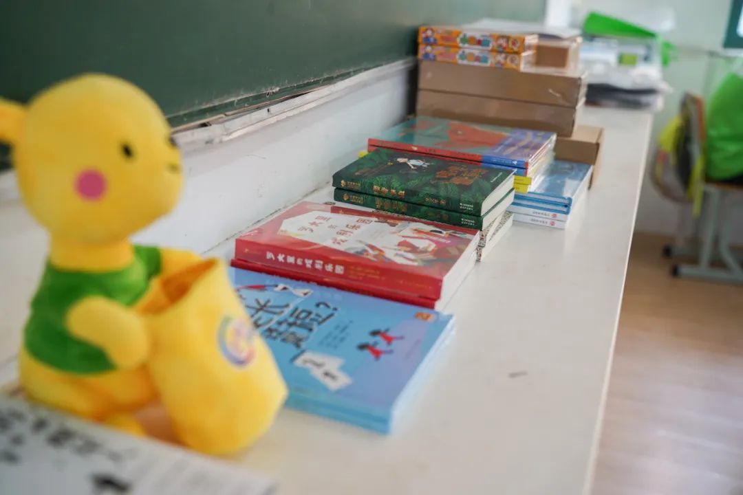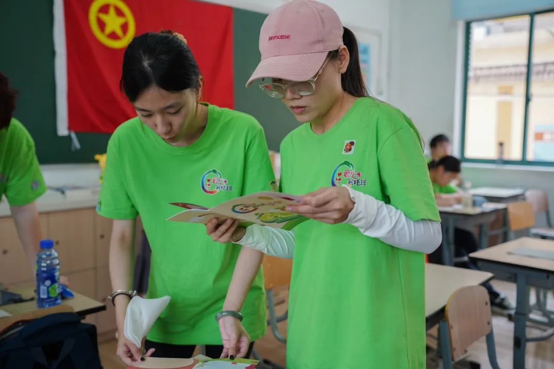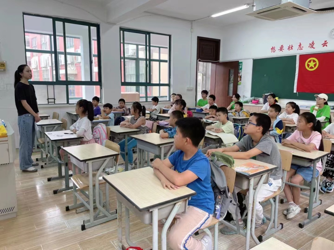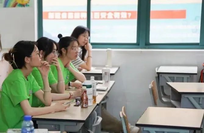 每班除了一名班主任还有三名大学生志愿者和两名高中生志愿者,他们身穿绿色马甲,在教室后面默默关注着,时不时贴心地为孩子们送上纸巾、书籍等,引导小学生做好日常行为规范。